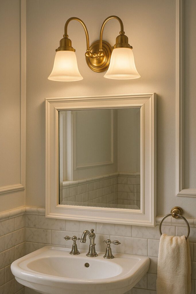 - Mirror: Matching pair of wall lights with glass shades, mounted either side of the mirror at eye level.