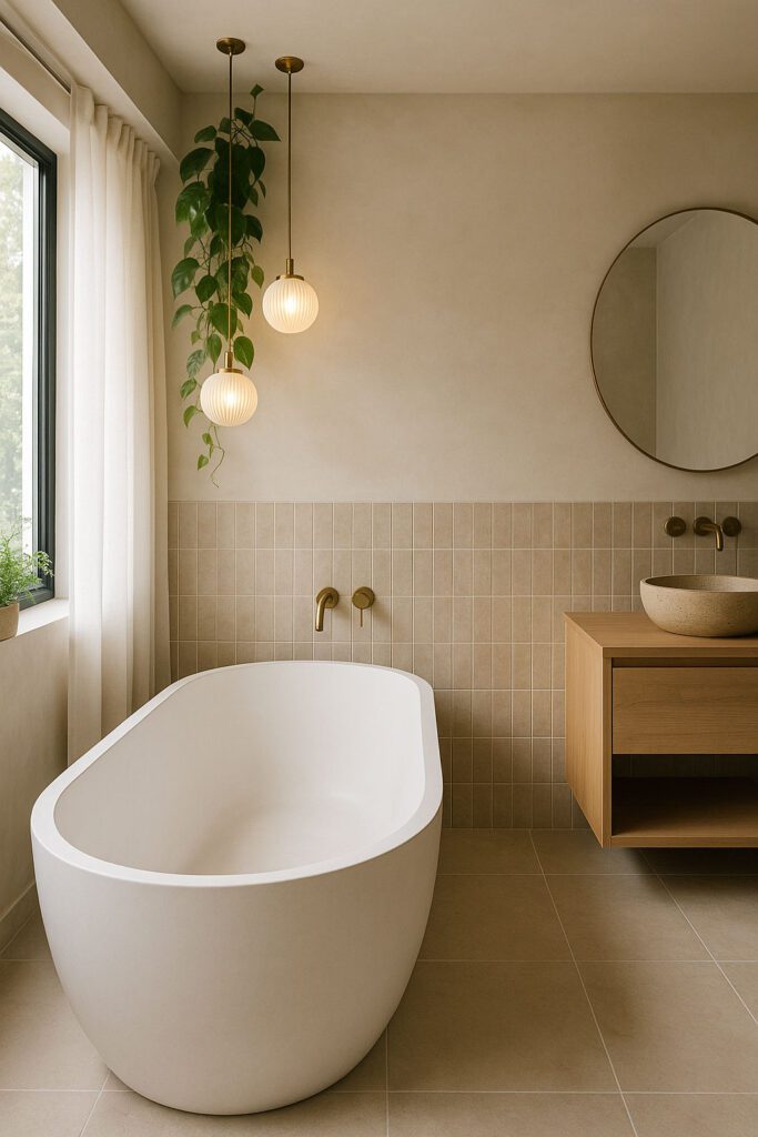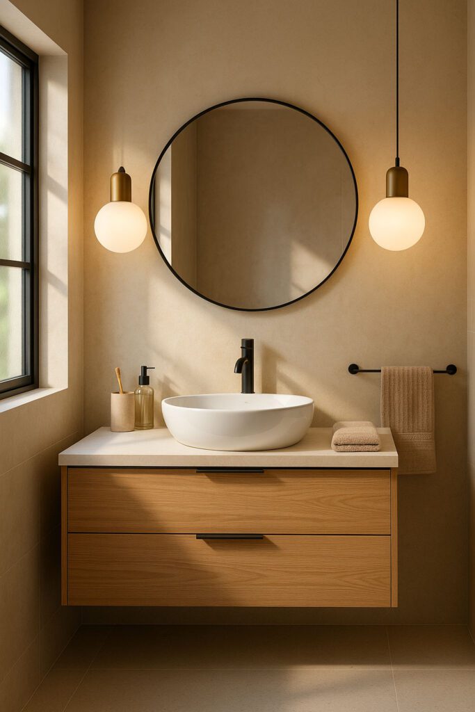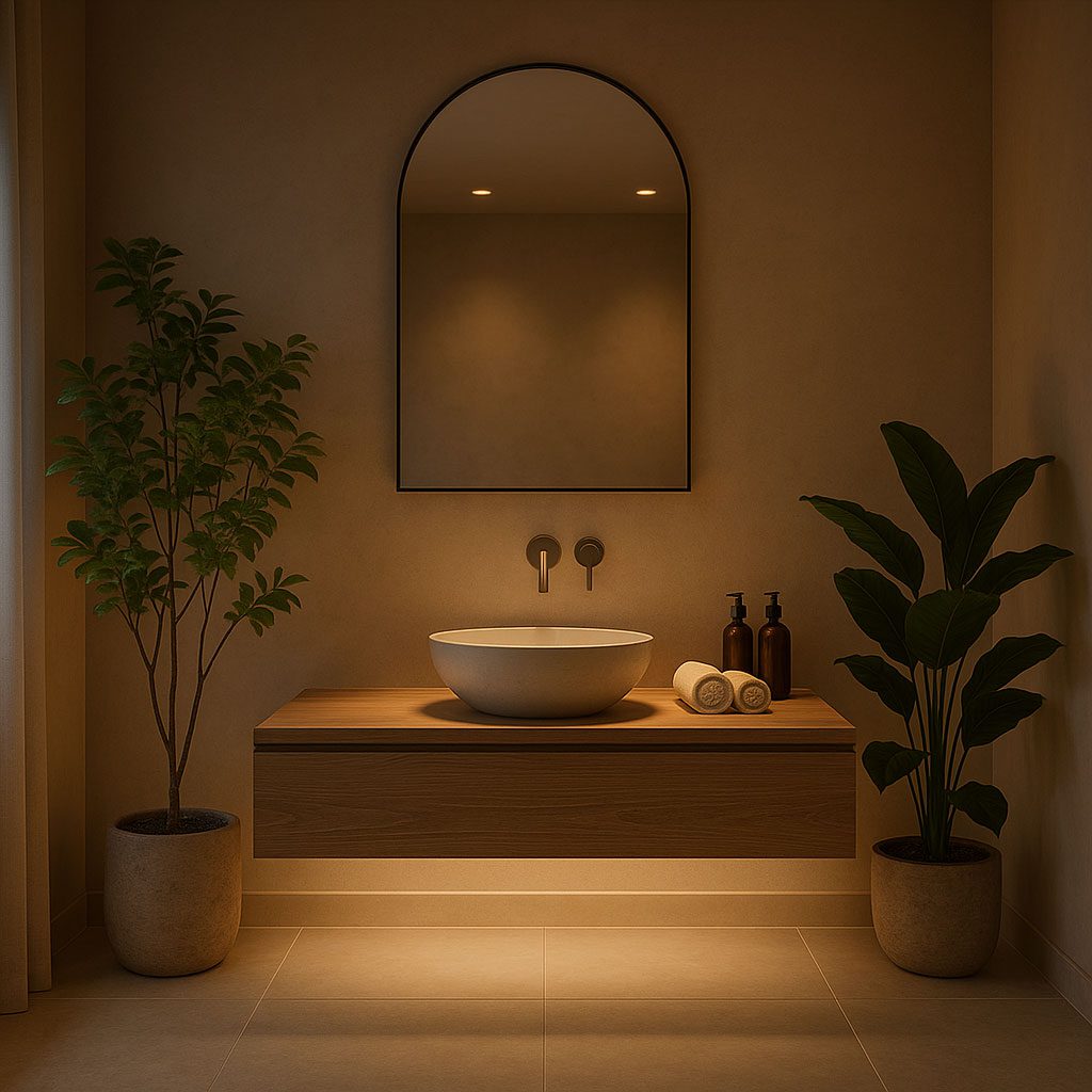 Consider LED strip lighting under floating furniture or behind the mirror for accent lighting. A simple plug in LED strip with inline switch works well and avoids additional wiring.