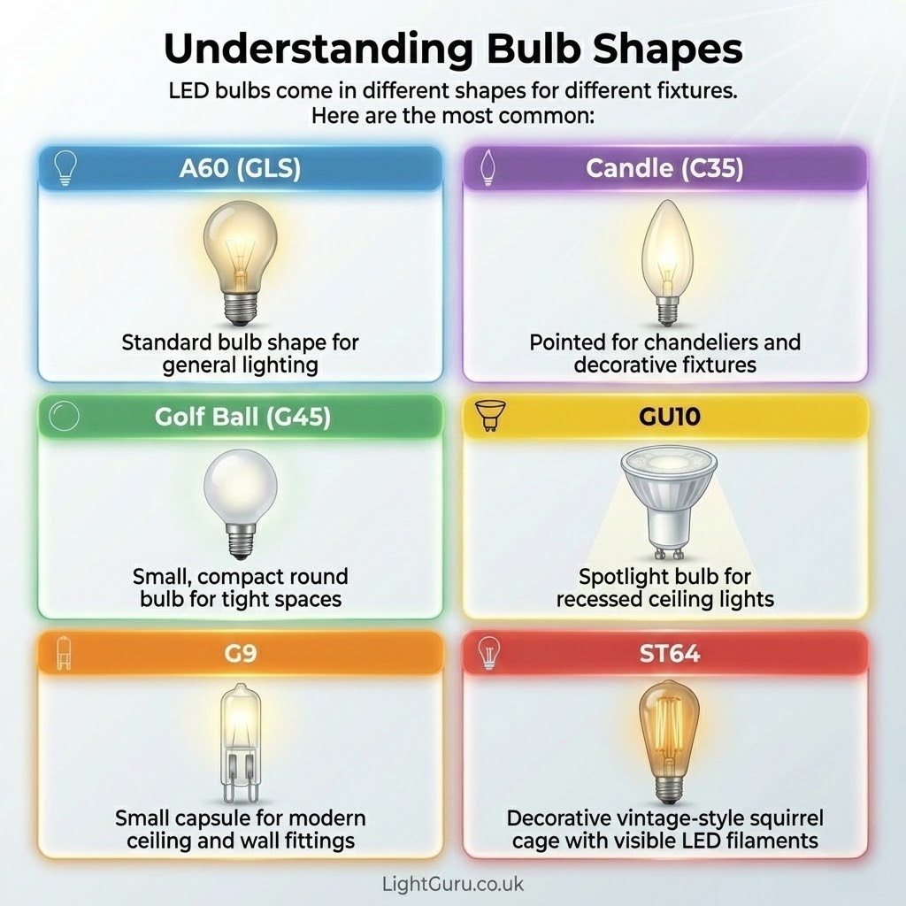 LED bulbs come in different shapes for different fixtures. Here are the most common: