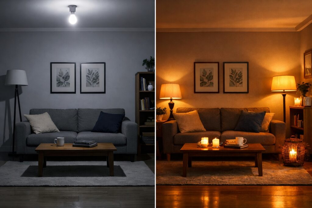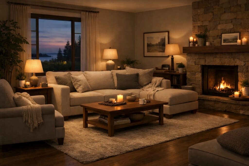 Lighting plays a major role in how a living room feels emotionally. Bright, flat lighting can make a space feel cold or uninviting, while warm, layered lighting adds softness and depth.