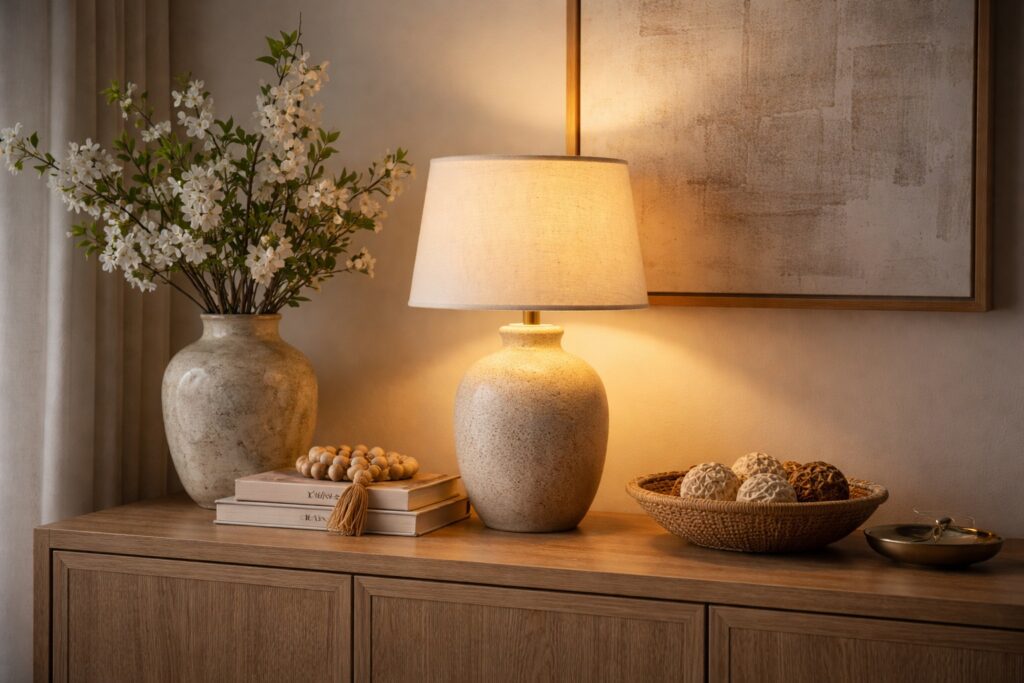 <!– AFFILIATE PLACEHOLDER: Pair of ceramic/textured table lamps with fabric shades. Price range £30-£60 each. Examples: Dunelm ceramic lamp, Amazon Basics ceramic set. –>