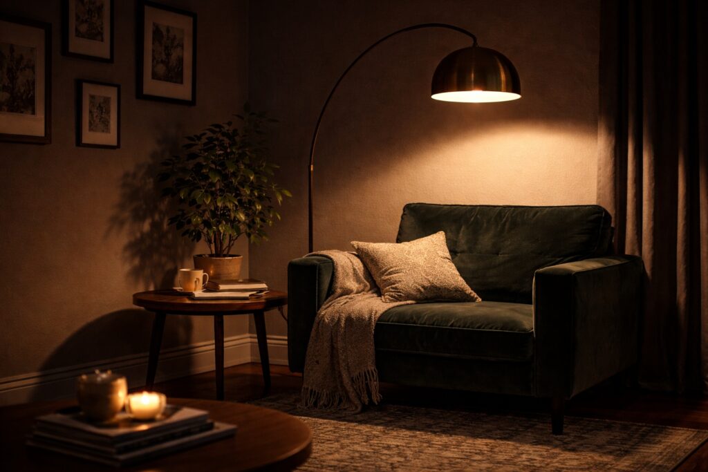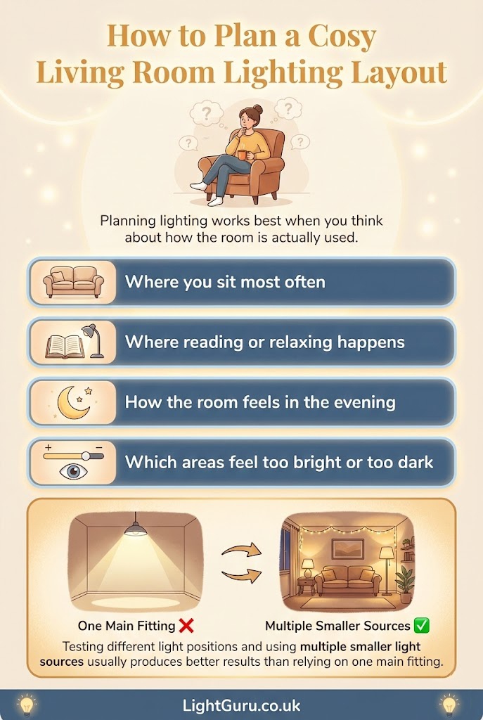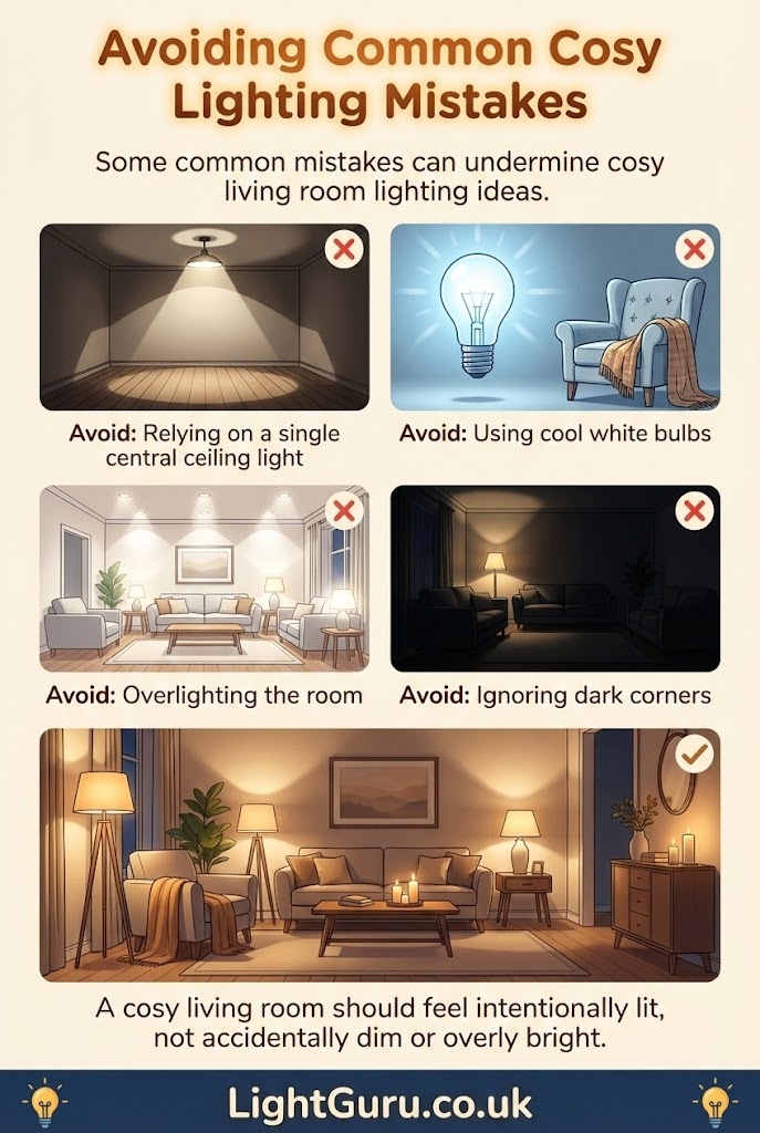 A cosy living room should feel intentionally lit, not accidentally dim or overly bright.