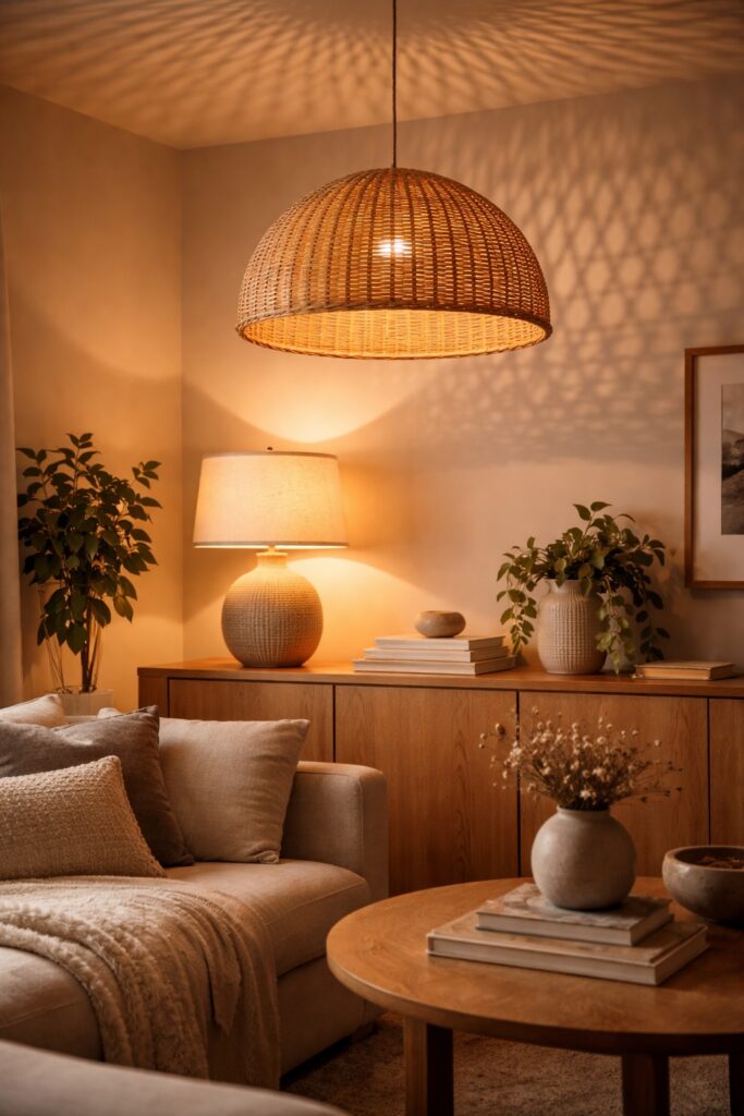 A woven or rattan pendant creates soft, diffused light and adds natural texture. Look for shades with an open weave that lets light filter through the material, casting gentle patterns on the ceiling.