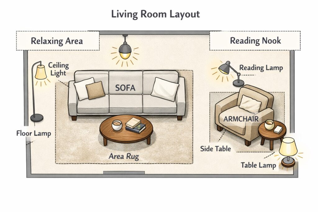 Using recognised layered lighting principles helps balance ambient, accent, and task lighting so living rooms feel comfortable rather than overlit.