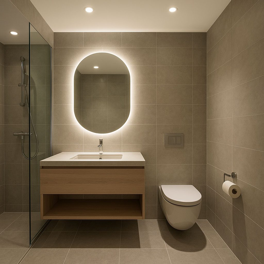Key considerations: Use IP65-rated bathroom downlights in wet zones. Position fittings to light the face at the mirror from the front, not from directly above. Consider a separate circuit for shower area versus main bathroom.