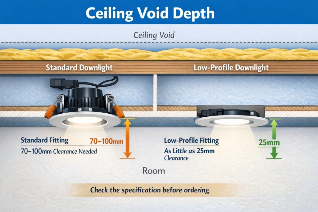 Downlights require space above the ceiling for the fitting body. Standard fittings need 70–100mm clearance. Low-profile models suit ceilings with limited void depth—some require as little as 25mm. Check the specification before ordering.
