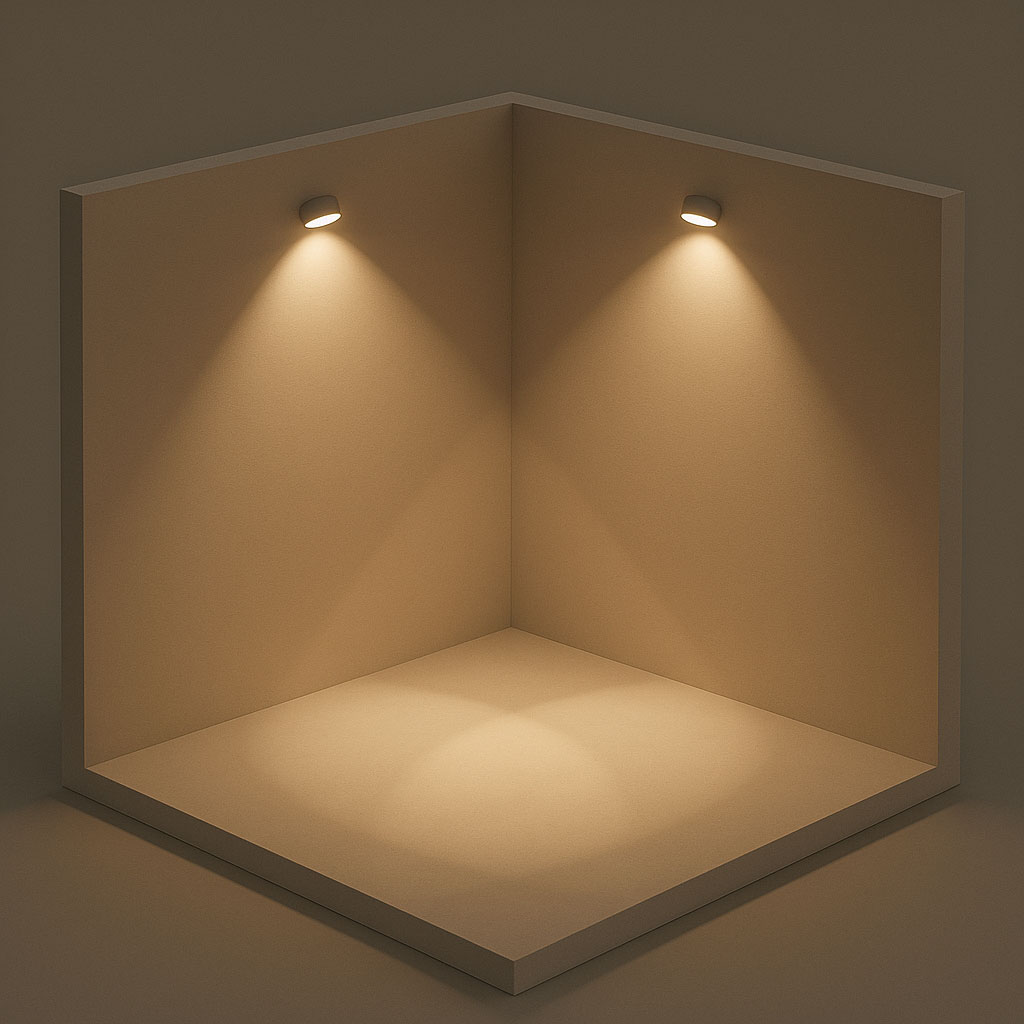 The calculator above takes your room dimensions, ceiling height, and downlight specifications to generate an evenly spaced layout. Enter your values and it calculates the optimal grid pattern, estimates the resulting brightness, shows beam coverage, and produces a downloadable layout you can share with your electrician.