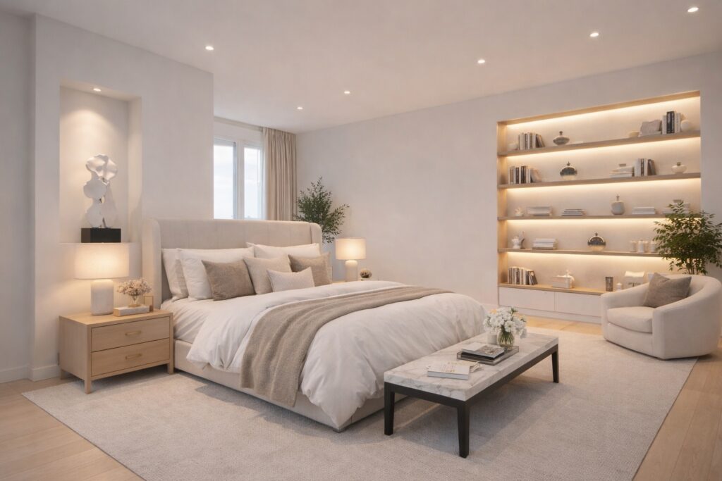 Key considerations: Avoid placing downlights directly above the bed—lying in bed looking up at a bright light is uncomfortable. Position fittings around the perimeter or toward the wardrobe area.