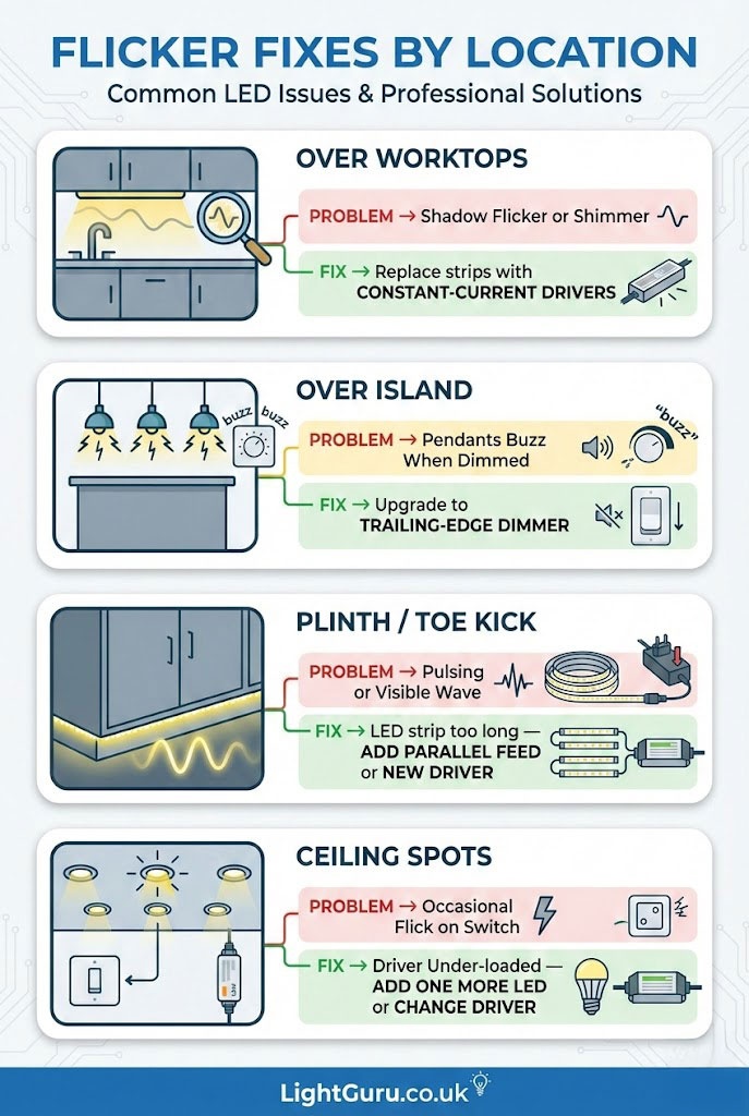 Flickering and buzzing in LED kitchen lighting are usually caused by compatibility or installation issues rather than faults with the LEDs themselves. Identifying the source of the problem, such as dimmer compatibility, driver loading, or wiring, makes it possible to resolve most issues effectively.