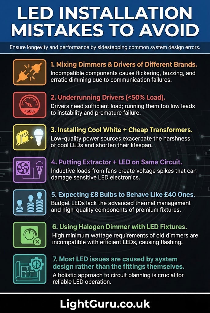 Flickering LED kitchen lights and buzzing sounds are common and frustrating issues, but they are usually caused by problems with dimmer compatibility, wiring, or power regulation rather than the LED fittings themselves.