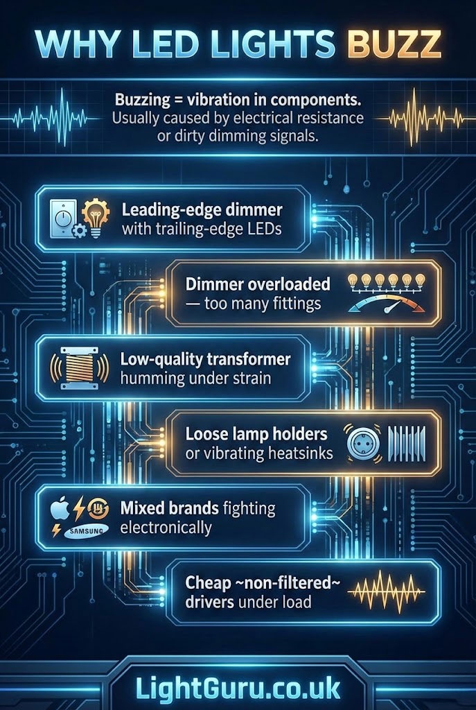 Buzzing is the sound of physical vibration inside the electrical components. When an incompatible dimmer chops up the alternating current (AC) from your mains power to lower the brightness, it creates harsh electrical spikes. These spikes cause the internal components of the LED bulb or the transformer to vibrate rapidly, creating an audible hum. Swapping to a high-quality trailing-edge dimmer smooths out these spikes, silencing the buzz.