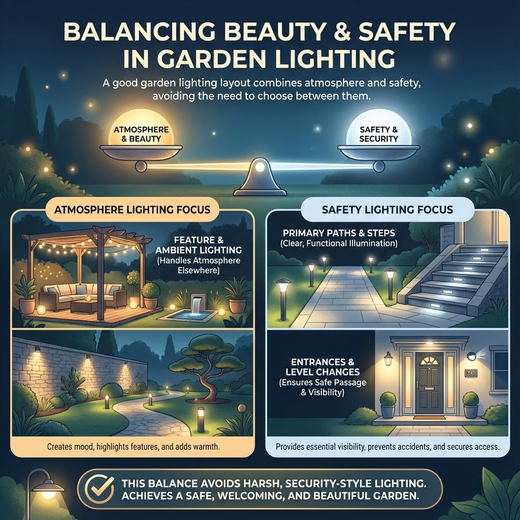 A good garden lighting layout does not choose between atmosphere and safety. It combines both.