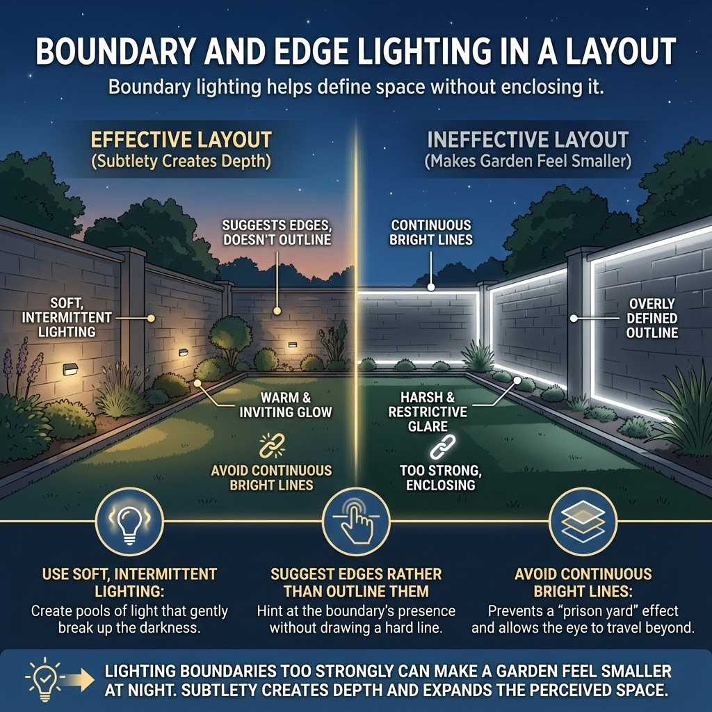 Lighting boundaries too strongly can make a garden feel smaller at night. Subtlety creates depth.