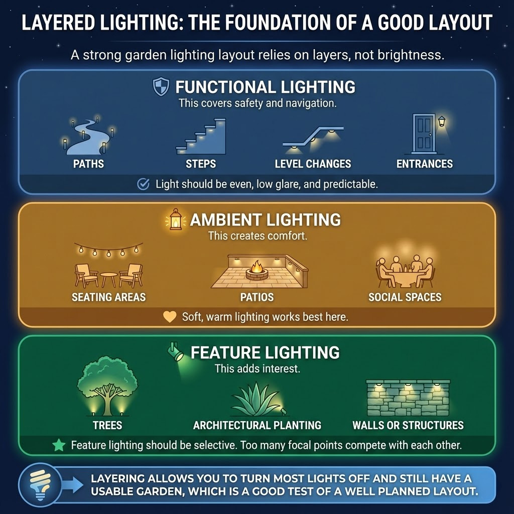 A strong garden lighting layout relies on layers, not brightness.