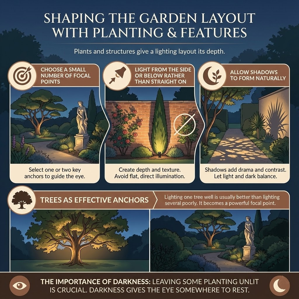 Layout is not about symmetry or filling space. It is about guiding movement and shaping how the garden is seen after dark.