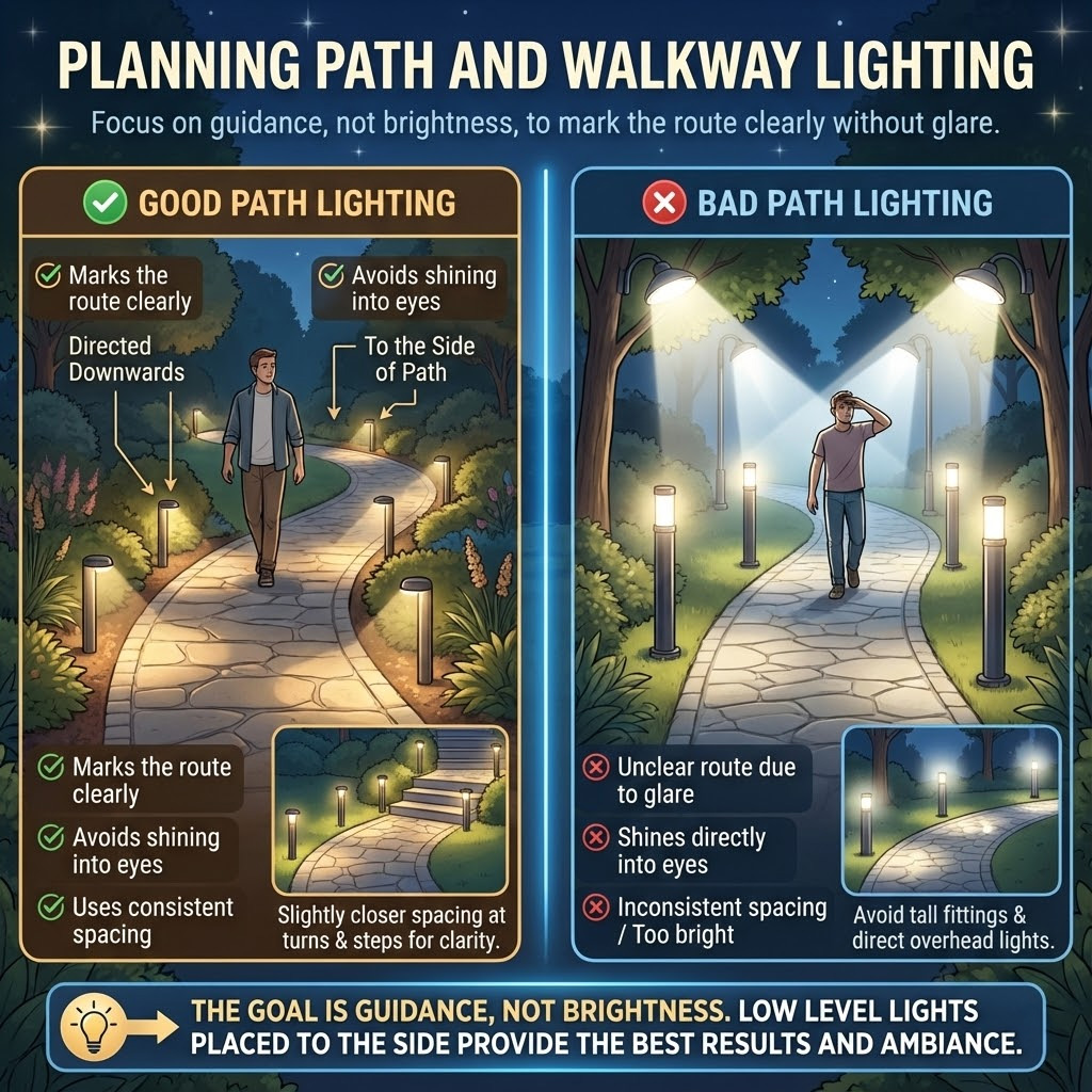 Low level lights placed to the side of paths usually work better than tall fittings or lights placed directly overhead. The goal is guidance, not brightness.