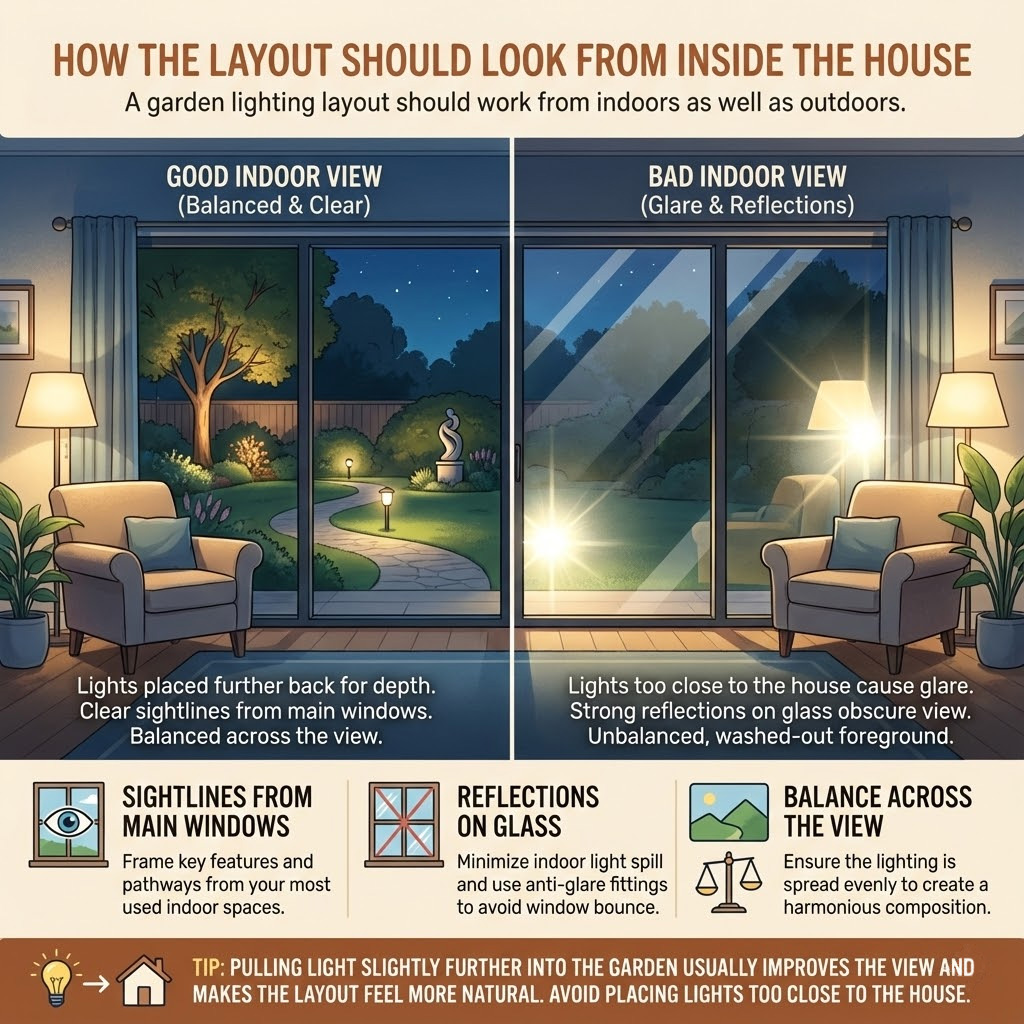Lighting placed too close to the house often causes glare indoors. Pulling light slightly further into the garden usually improves the view and makes the layout feel more natural.