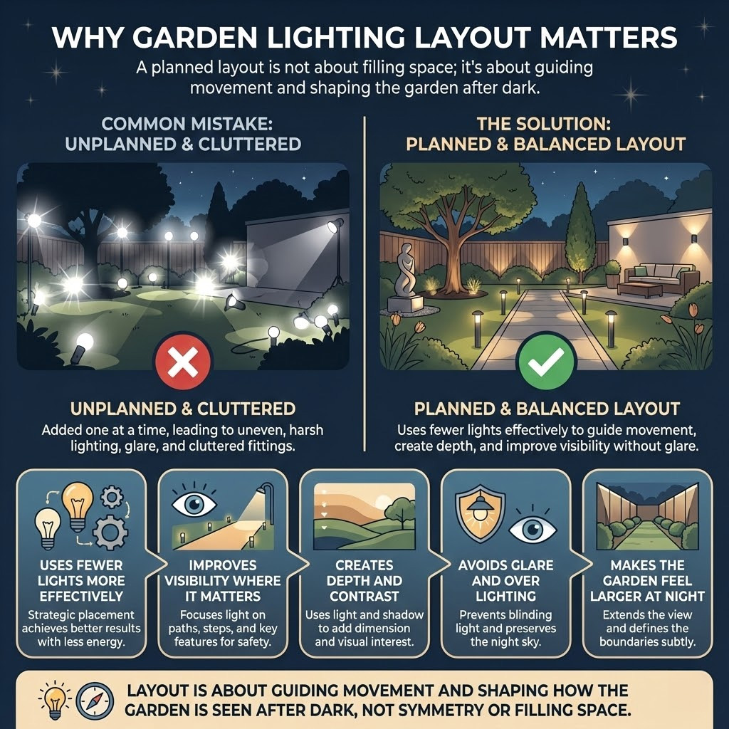Garden lighting layout is not about choosing fittings, but deciding where light is actually needed. Even high-quality lights fail when the layout is wrong.