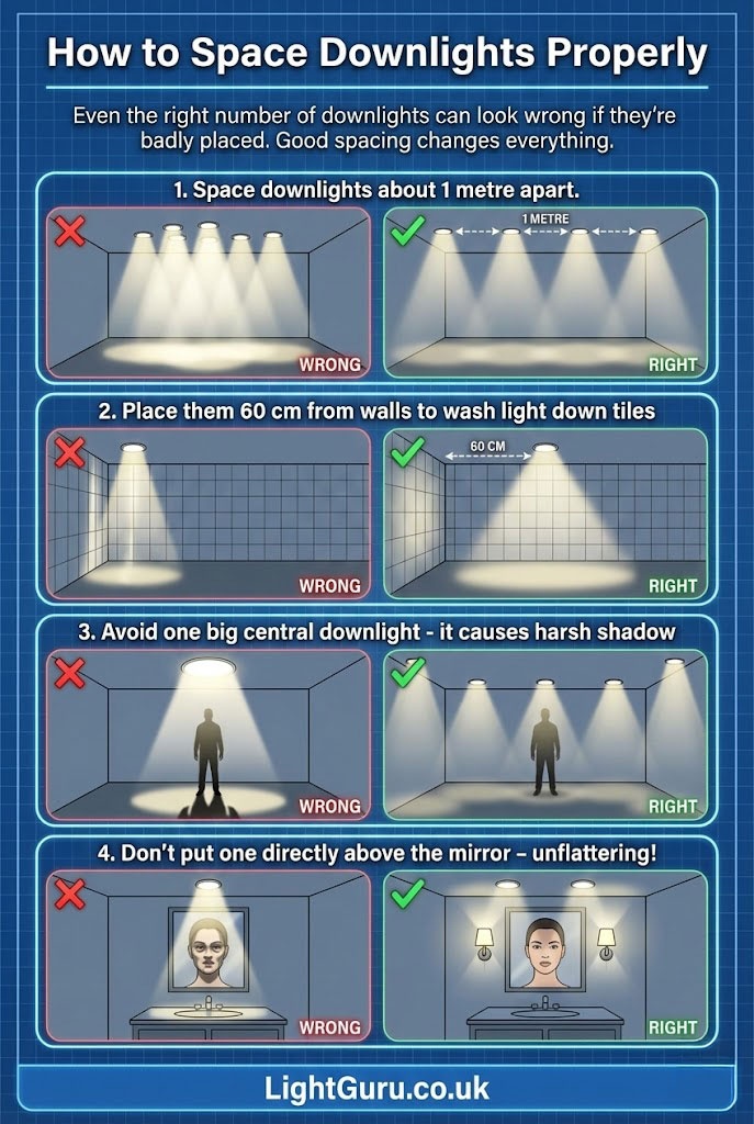 Even the right number of downlights can look wrong if they’re badly placed. Good spacing changes everything.