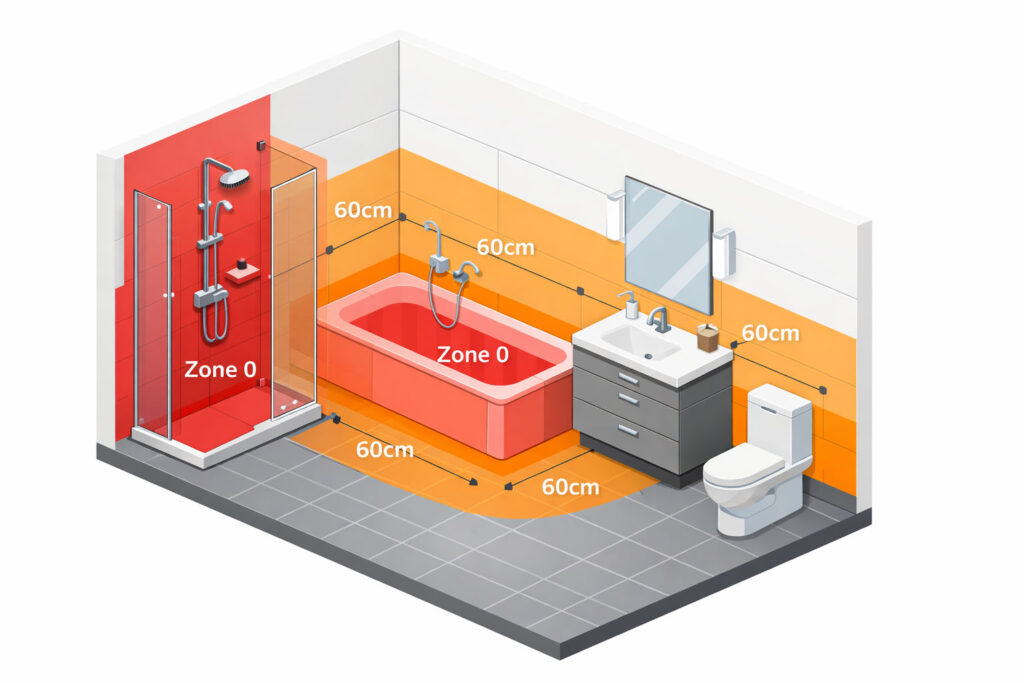 • Zone 2 (The 60cm perimeter around the sink, bath, and shower): This area is prone to splashing. Lights here must be at least IP44 rated (protected against water spray).