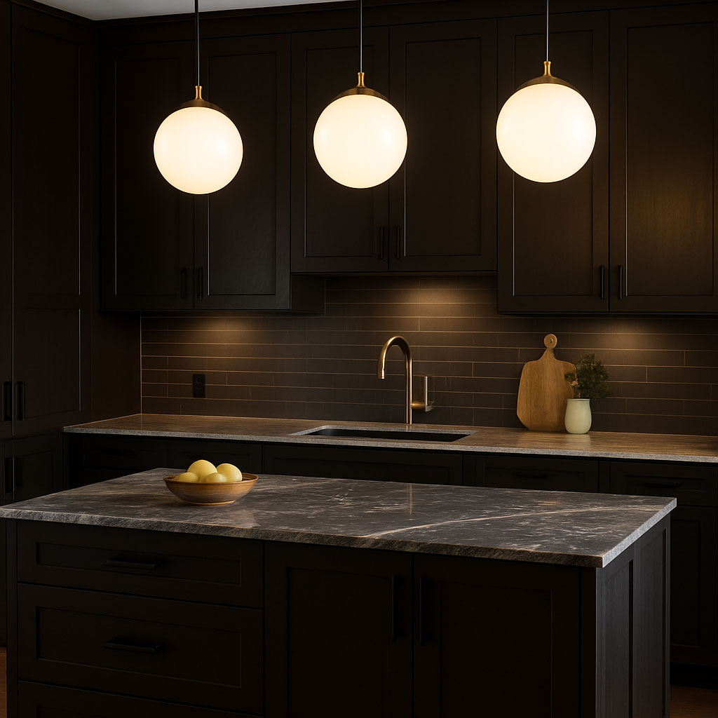 “Dark cabinetry kitchen with opal globe pendants adding soft brightness”