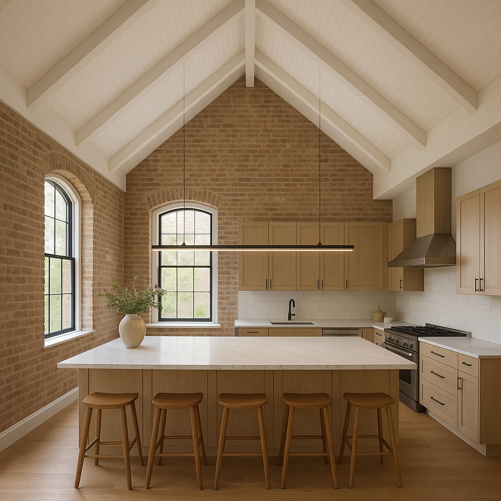 “High-ceiling converted home with long-stem linear pendant over large island”