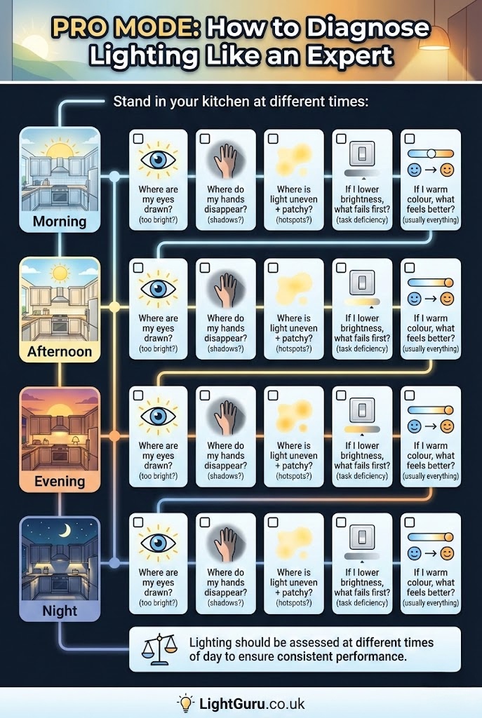 This guide focuses on fixing specific lighting defects like glare and shadows. For full kitchen room planning, layout, and brightness guidance, see our complete lighting guide.