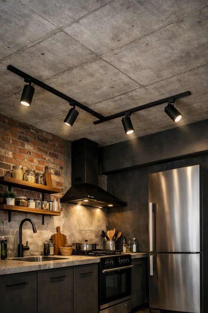 Track lighting offers more flexibility. Individual heads can be aimed where light is needed most, making it useful in kitchens with unusual layouts or where fittings cannot be positioned symmetrically. Track systems also work well in modern kitchens where a more architectural look is wanted.