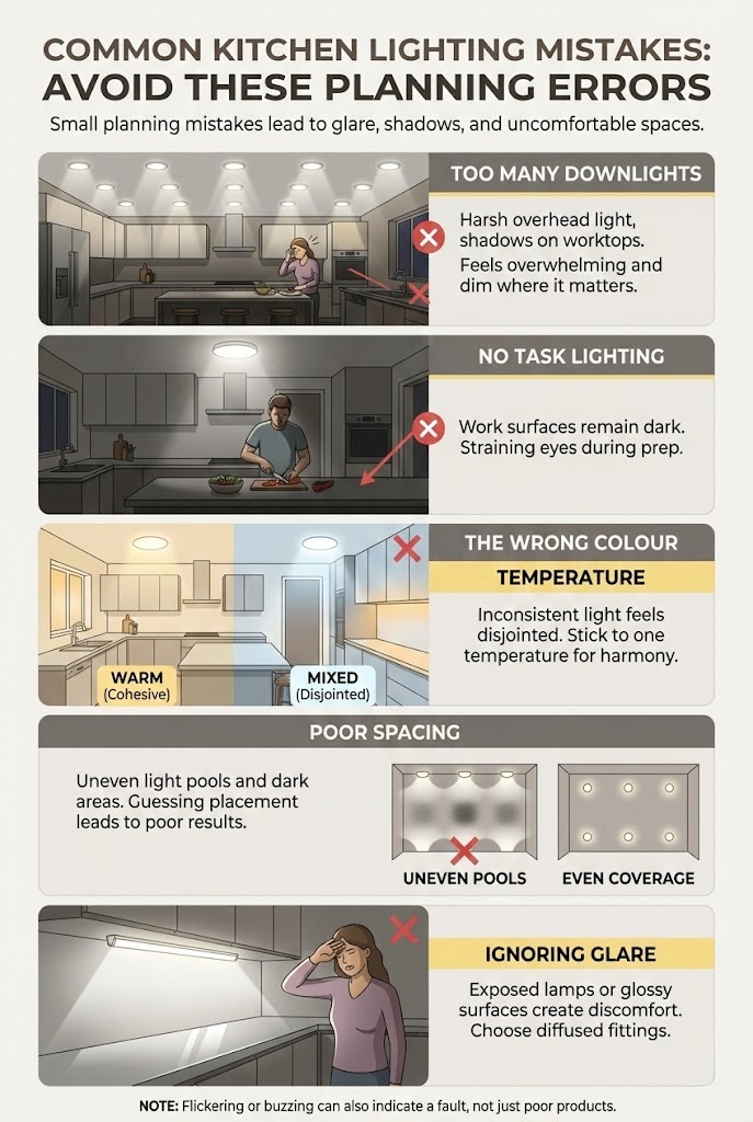 Many kitchen lighting problems are not caused by bad products, but by poor planning. Small mistakes made early can lead to glare, shadows, and spaces that feel uncomfortable to use day to day.