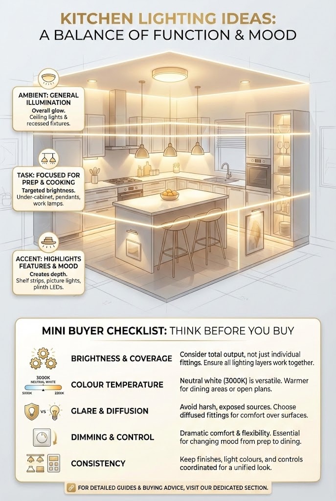 The fix is not one “perfect” fitting. It’s a simple system: layered lighting. You combine general lighting for the whole room, task lighting where you actually work, and a softer layer for mood and depth. Once you understand that, the choices become much easier, whether you’re planning a new kitchen or improving the one you have.