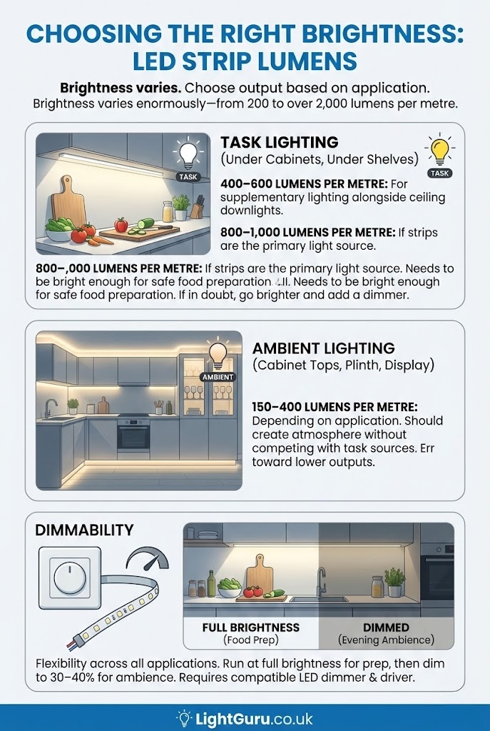 Brightness: 400–600 lumens per metre for effective task lighting. Go higher (up to 800–1,000 lm/m) if under-cabinet strips are your primary worktop light source.