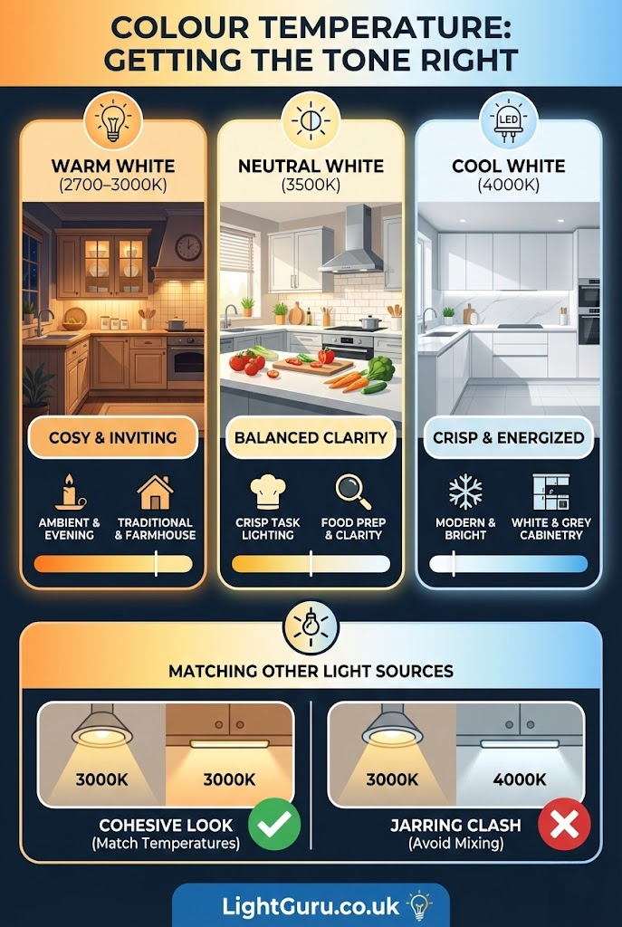 Colour temperature significantly affects how your kitchen feels. The wrong choice can make a space feel clinical, dingy, or disconnected from adjoining rooms.