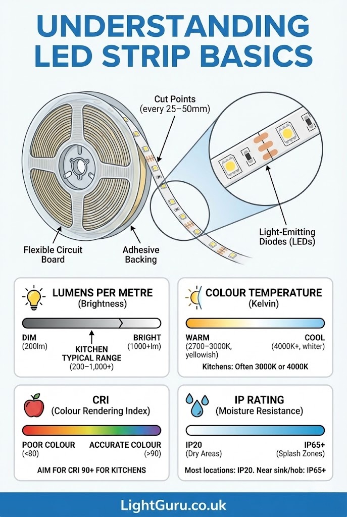 LED strips consist of small light-emitting diodes mounted on a flexible circuit board with adhesive backing. They’re sold in reels (typically 5 metres) and can be cut to length at marked intervals, usually every 25–50mm.