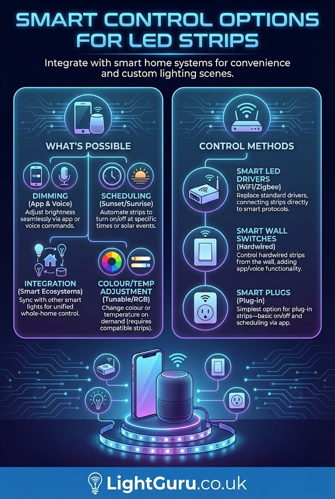 Hardwired installations connect strips directly to the lighting circuit, controlled by wall switches or smart systems. This is neater and more permanent but requires an electrician for UK compliance.