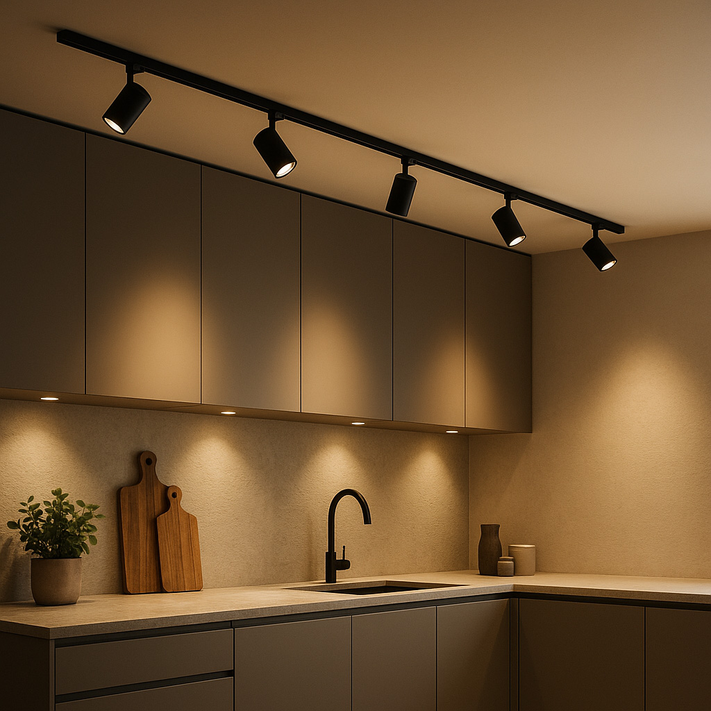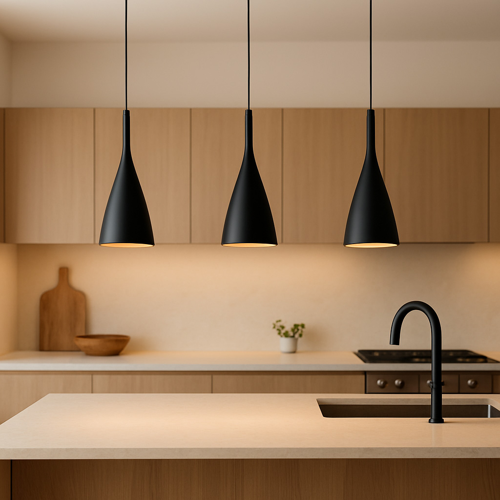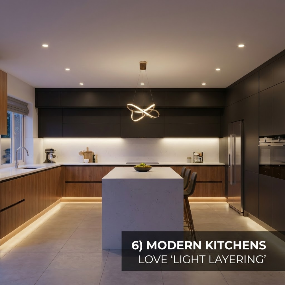 Modern kitchens are not defined solely by bright white lighting, kitchen lighting often uses warmer tones with minimal detailing, controlled, layered, and suitable for dimming.