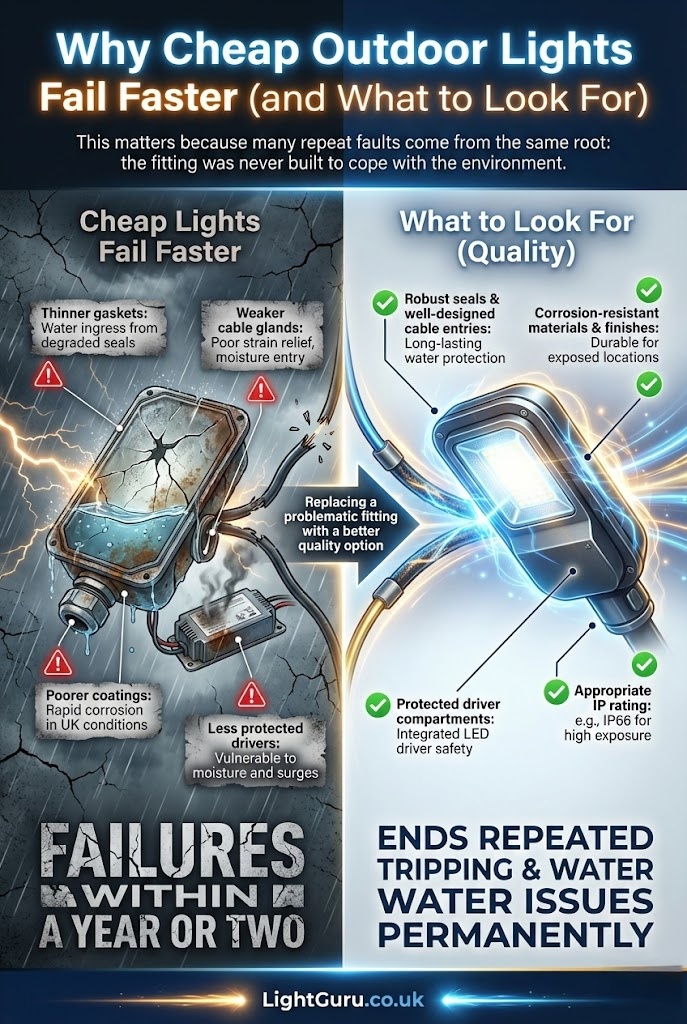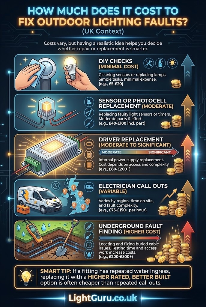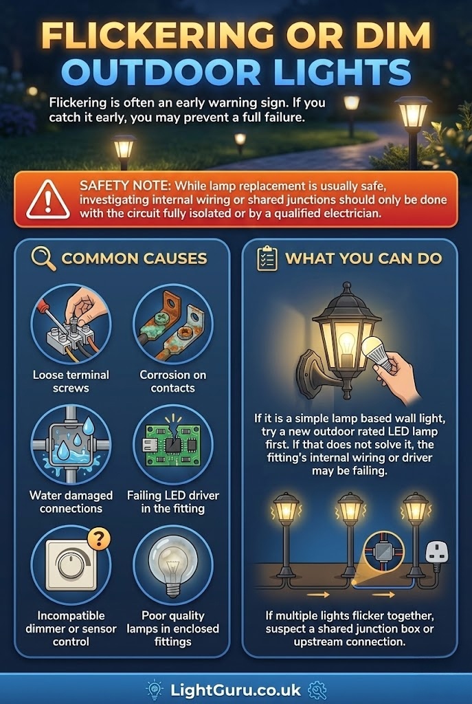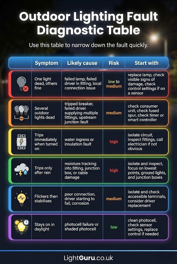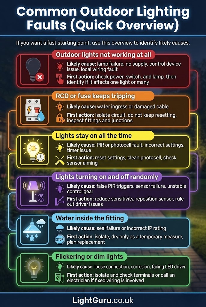 Safety notice: Outdoor lighting faults often involve electricity, moisture, and fixed wiring. This guide provides general information and covers basic visual checks homeowners can safely perform. Always isolate power before inspecting any fitting. If faults persist, a qualified electrician should be consulted.