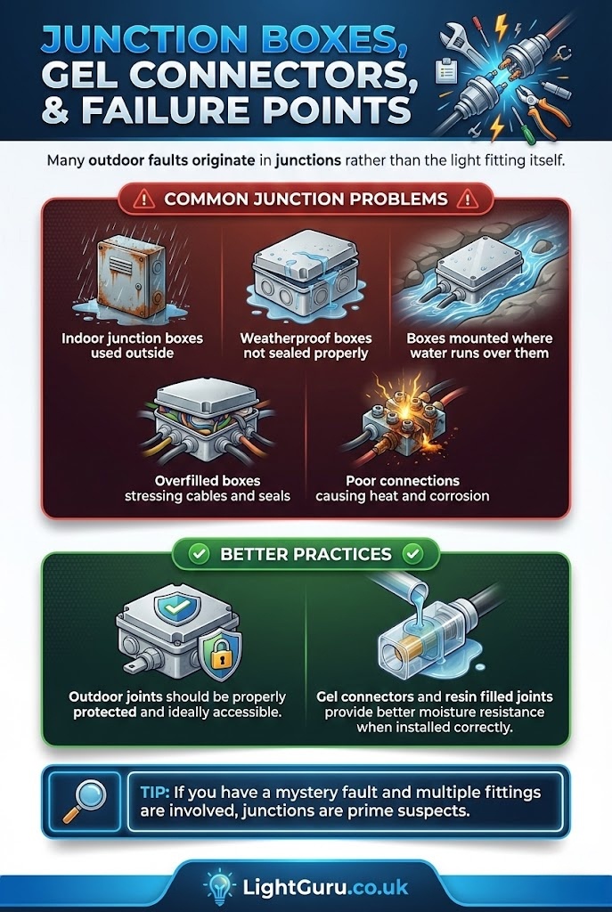 With quality fittings, correct IP ratings, well protected cable routes, accessible junctions, and sensible maintenance, outdoor lighting can be reliable for years. Use this guide to diagnose issues intelligently, but also to prevent them by improving how outdoor lighting is chosen, installed, and maintained.