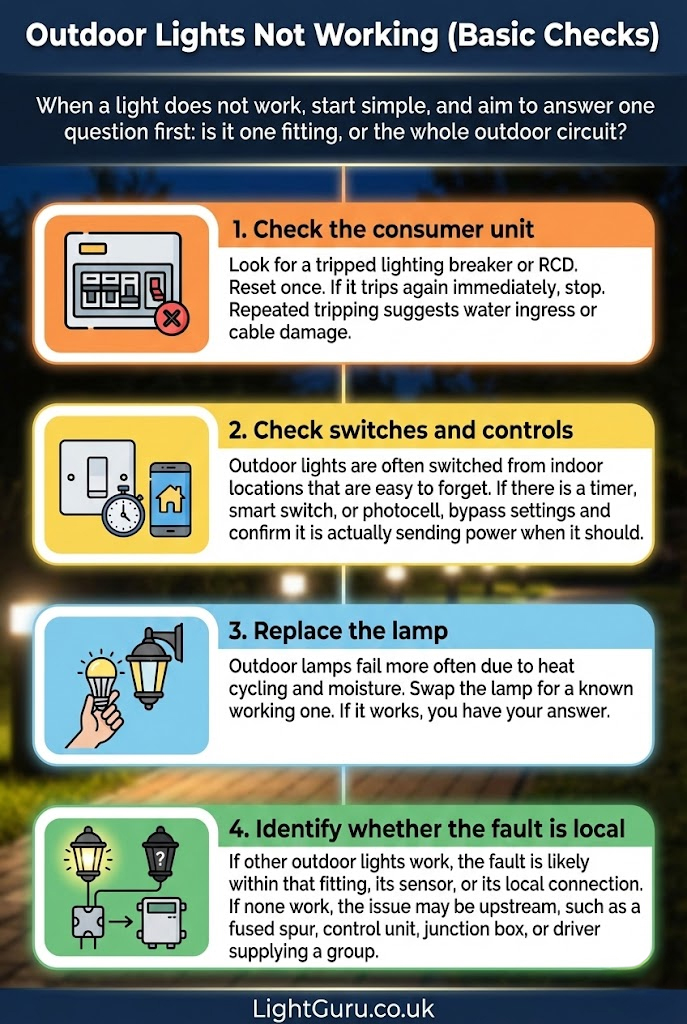 When a light does not work, start simple, and aim to answer one question first: is it one fitting, or the whole outdoor circuit?