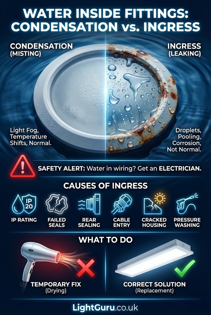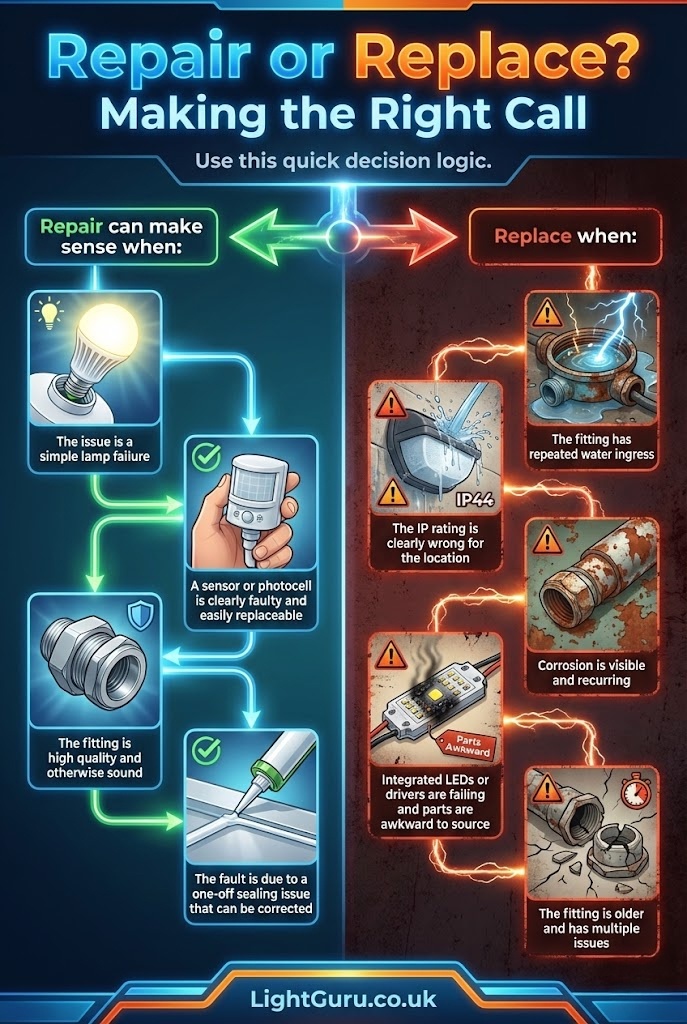 When a fitting has repeated water ingress, corrosion, or an unsuitable IP rating for its location, replacement is usually the smarter long term option.