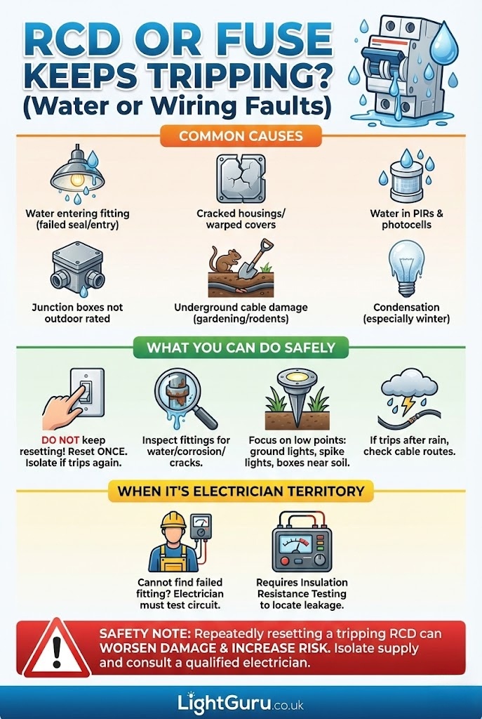 An RCD trips when current leaks to earth. Outdoors, that is commonly caused by moisture bridging connections inside a fitting, water inside a junction box, or damaged insulation in a cable.