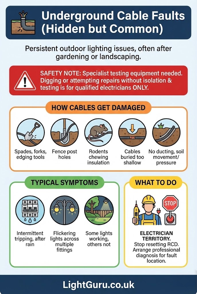 Finally, physical damage is common. Spades, lawn edging tools, fence posts, and even pressure washers can damage cables and fittings. Underground cable faults are especially common where burial depth is shallow or ducting was never used.