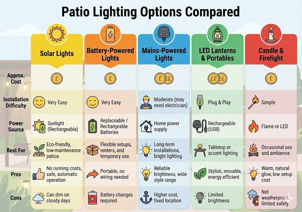 To help you decide, we’ve compared the most popular patio lighting options available in the UK. We’ve broken them down by cost, installation effort, and power source so you can see at a glance what works for your garden