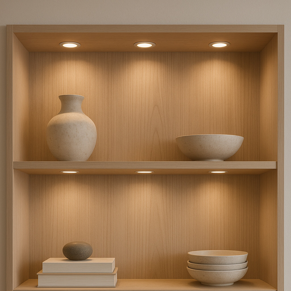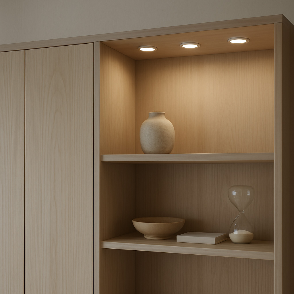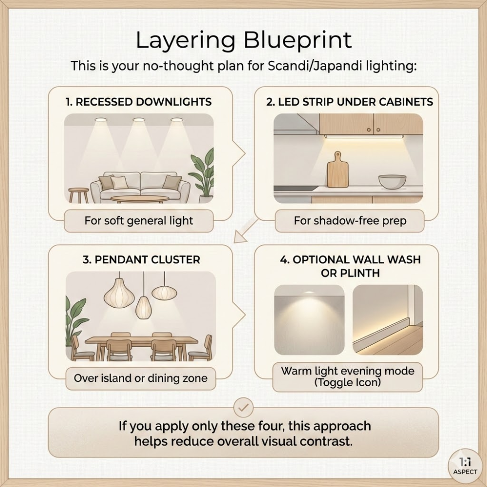Scandi and Japandi kitchen lighting is typically planned around warm colour temperatures, diffused light sources, and simple fixture forms. Recessed downlights, LED strip lighting, and pendants are used in combination to provide functional illumination while limiting glare and contrast.