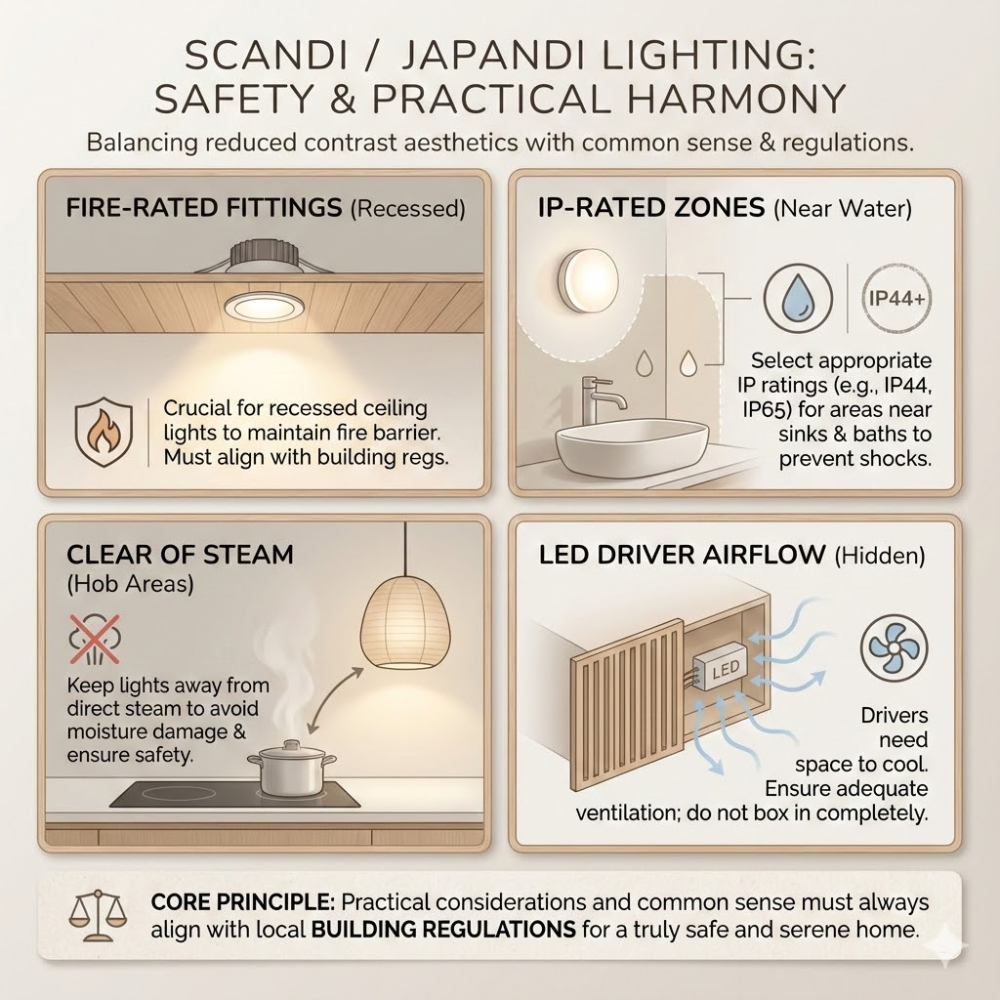 Consistent colour temperature, usually between 2700K and 3000K, helps these lighting layers work together across the space. When lighting is planned alongside materials and layout, Scandi and Japandi kitchens remain practical while maintaining a restrained, natural appearance.