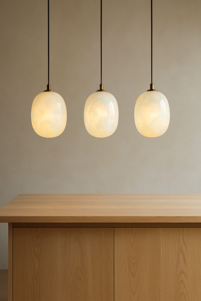 Pendants are the prominent feature of a Japandi kitchen — simple, sculptural, natural.