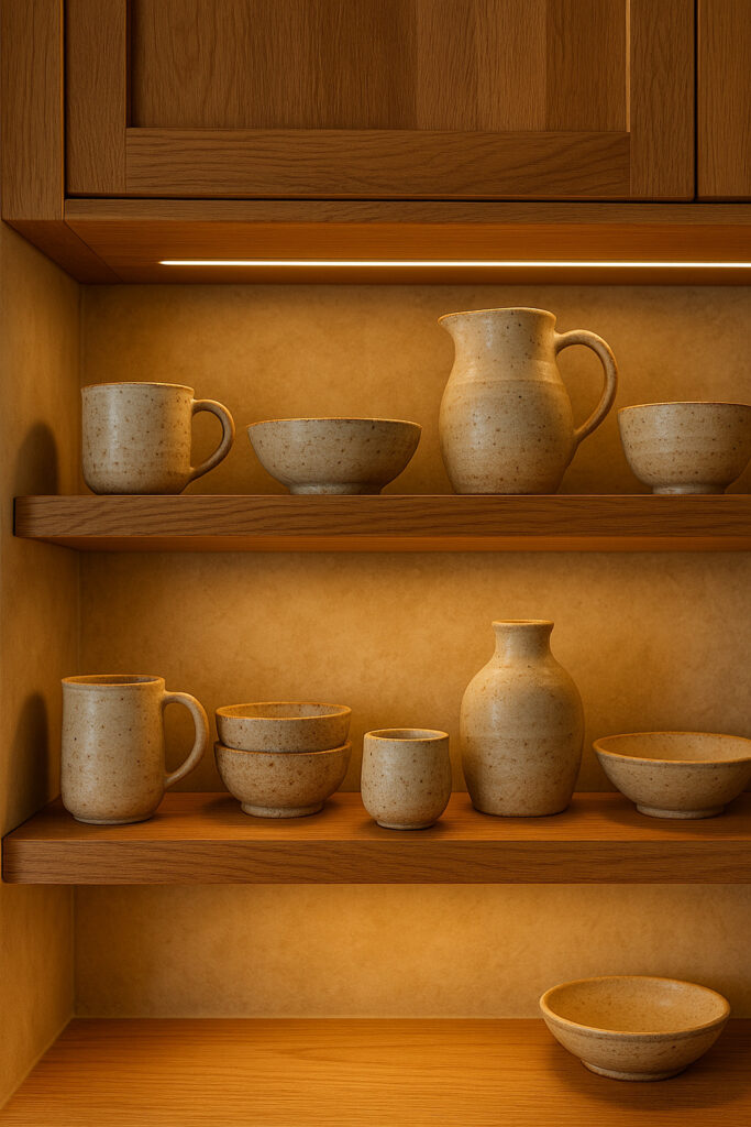 - Inside alcoves + shelves → highlight pottery, stone, wood