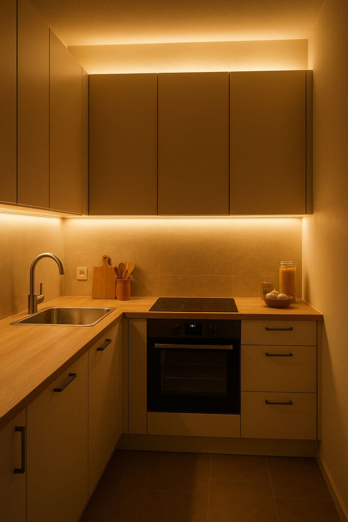 LED strips are a commonly used solution in compact layouts — they eliminate shadows instantly.