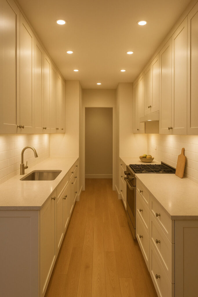 This guide focuses on specific layouts for compact spaces. For full kitchen lighting planning, see our complete Kitchen Lighting Ideas guide.